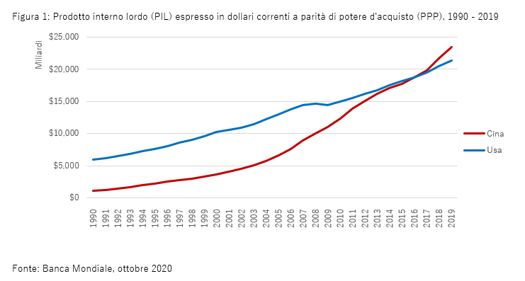 È sorprendente quanto la Cina sia cresciuta rapidamente, in particolare dal momento in cui, come economia in via di sviluppo, nel 2001 è entrata a far parte dell’Organizzazione mondiale del commercio (Figura 1). È utile notare che i negoziati tra Usa e Cina si erano conclusi positivamente nel novembre 1999, una conferma del fatto che gli Usa furono il primo paese interessato ad accedere sia ai fattori di produzione cinesi che alla domanda interna cinese. Non solo la crescita cinese è stata così rapida da portare il prodotto interno lordo a parità di potere d’acquisto ad un livello superiore a quello degli Usa già nel 2017, ma essa è stata anche coordinata in modo che la Cina abbia potuto iniziare a competere nei settori tecnologicamente avanzati, tradizionalmente di predominio degli Usa.