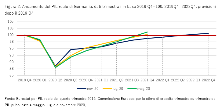 In Figura 2, dedicata alla Germania, la linea rossa orizzontale a livello 100 delle ordinate è solo un ausilio per proiettare nel futuro il livello del pil nel 2019 e rendere così agevole le comparazioni. Le tre rappresentazioni della traiettoria del pil sono relative rispettivamente alle previsioni della Commissione europea di maggio, quelle di luglio, e quelle di novembre. Che cosa impariamo da queste traiettorie, stimate e pubblicate in momenti diversi?