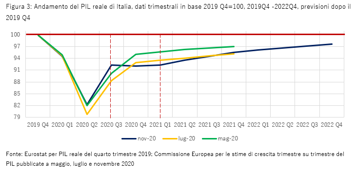 - Cominciando dal medio periodo, si vede che secondo le previsioni di maggio nel quarto trimestre 2021 il pil avrebbe dovuto essere circa il 97% di quello del 2019, ma le previsioni posteriori, di luglio e di novembre, sono entrambe peggiori (e uguali).