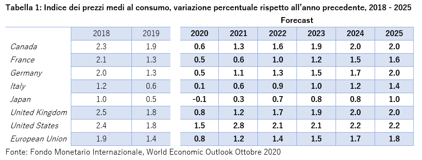 Qui di seguito riportiamo le previsioni pubblicate il 13 ottobre 2020 dal Fondo Monetario Internazionale, quelle pubblicate il 5 novembre dalla Commissione europea, e quelle Istat relative alla sola Italia del 30 novembre.Le previsioni del FMI mostrano che solo gli Stati uniti, tra i paesi del G7, registreranno un’inflazione superiore al 2% prima del 2022. Tra 2024 e 2025, anche Regno unito e Canada raggiungeranno un’inflazione del 2%, a differenza degli altri paesi inclusa l’Unione europea in cui l’inflazione rimarrà al di sotto di tale soglia.