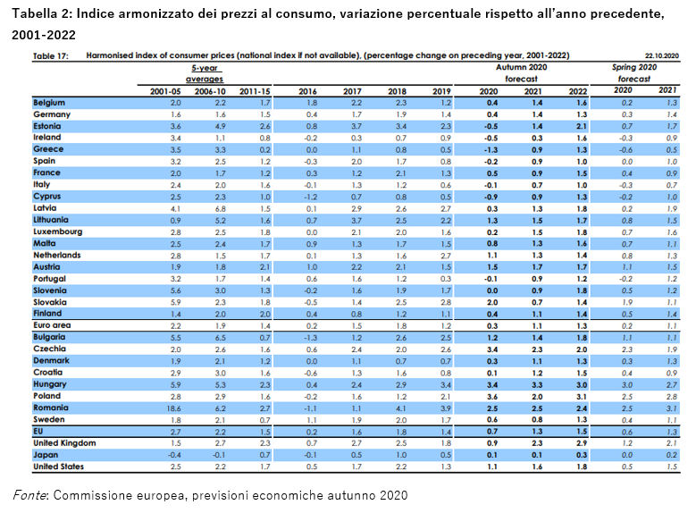 La Commissione europea stima per l’Unione europea nel suo complesso un’inflazione dello 0,7% nel 2020, dell’1,3% nel 2021 e dell’1,5% nel 2022, mentre per l’Unione economica e monetaria un’inflazione dello 0,3 nel 2020, dell’1,1% nel 2021 e dell’1,3% nel 2022 (Tabella 2).