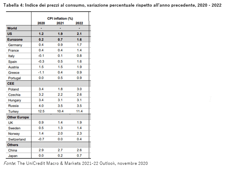 Infine, Tabella 3 e Tabelle 4 mostrano le previsioni dell’ufficio ricerche di Unicredit, pubblicate a novembre 2020, su inflazione per trimestre e anno-su-anno.