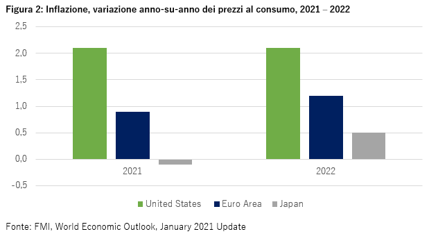 L’aggiornamento del Fondo monetario internazionale pubblicato a gennaio 2021 mostra un’inflazione in aumento nel 2021 e 2022 per i paesi ad alto reddito pro-capite: poco superiore al 2% per gli Usa e ampiamente sotto il 2% per l’Uem (Figura 9).