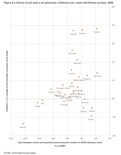 La stima del pil potenziale si basa sulla dotazione di fattori produttivi disponibili (capitale e lavoro); per sua natura, quindi, il pil potenziale non è immutabile nel tempo. Lo shock economico dovuto al Covid-19 e la lenta ripresa potrebbero ridurre il pil potenziale. Quale potrebbe essere l’effetto sull’inflazione di una riduzione del pil potenziale? Molto probabile che sia deflattivo: i fattori produttivi non rappresentano solo offerta, ma vengono remunerati e contribuiscono con spesa per investimenti e per consumi alla crescita del pil.