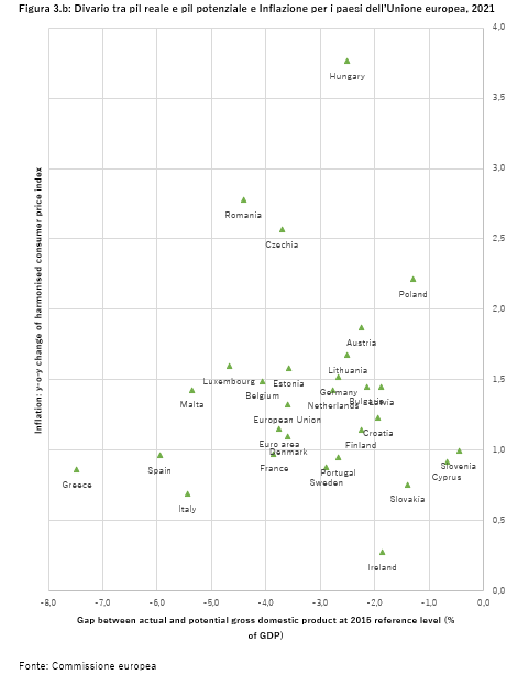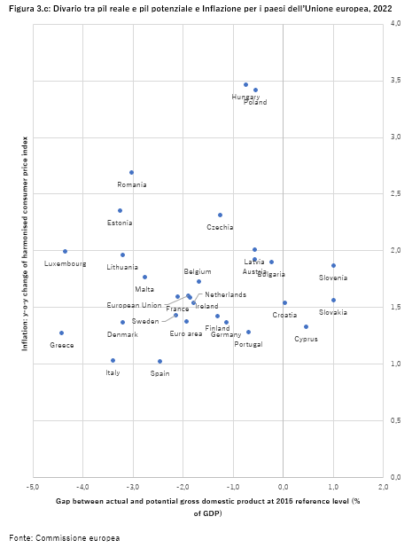 Dai dati della Commissione europea, aggiornati al 5 novembre 2020, si evince che per il 2020 e il 2021 tutti i paesi dell’Unione europea saranno lontani, alcuni molto, dal proprio pil potenziale e per il 2022, solo Polonia, Repubblica ceca, Romania e Ungheria lo supereranno (Figura 3). Il lettore interessato alla posizione di ciascun paese nel grafico di figura 3 può fare riferimento alle Figure 3.a, 3.b e 3.c in appendice all’articolo.