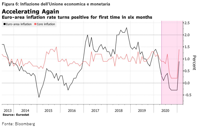 Come Bloombger ha riportato ad inizio febbraio, i prezzi al consumo sono aumentati dello 0,9% anno-su-anno, più di quanto previsto da alcuni economisti. Escludendo i prezzi di componenti volatili dell’indice come cibo ed energia, l’inflazione è aumentata dell’1,4%, tasso più alto in più di cinque anni (Figura 6). Nell’articolo citato, Bloomberg riporta la posizione di Isabel Schnabel, membro del board esecutivo della BCE che “[…] ha messo in guardia dal confondere i picchi a breve termine dei prezzi per pressioni inflazionistiche sostenute, sostenendo che la domanda rimarrà debole nei mesi a venire.” [traduzione, DL e FS].