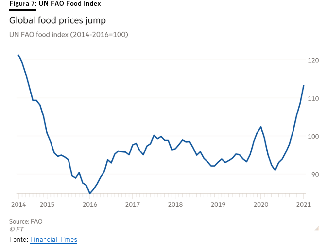 È bene tuttavia evidenziare che sebbene si tratti di aumenti temporanei, l’inflazione di alcune categorie merceologiche genera particolare attenzione; tra questi le materie prime alimentari. Si veda ad esempio, il grafico in Figura 7: l’Indice dei prezzi degli alimenti della FAO, che tiene traccia delle variazioni mensili dei prezzi internazionali dei prodotti alimentari ha registrato una media di 113,3 punti a gennaio, segnando un aumento del 4,3% da dicembre 2020 e raggiungendo il livello più alto da luglio 2014.