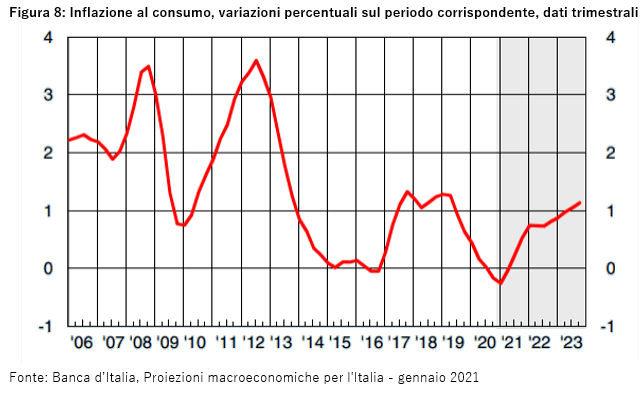 Un’ultima nota sull’inflazione al consumo in Italia (Figura 8), la riprendiamo dal recente aggiornamento delle “Proiezioni macroeconomiche per l’Italia” pubblicato il 19 gennaio da Banca d’Italia. In merito all’inflazione si legge: “L’inflazione rimarrebbe al di sotto dell’1 per cento quest’anno e il prossimo, risentendo degli ampi margini di capacità inutilizzata che frenerebbero gli aumenti salariali e le politiche di prezzo delle imprese; salirebbe all’1,1 per cento nel 2023. La componente di fondo rifletterebbe la debolezza della domanda, rimanendo su valori in media inferiori allo 0,5 per cento nel biennio 2021-22 e avvicinandosi all’1,0 per cento solo nell’ultimo anno dell’orizzonte previsivo”.