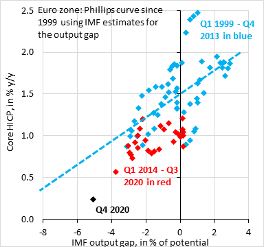 Sono interessanti alcuni grafici ripresi dai tweet di Robin Brooks, Chief Economist presso l’IIF. Ad esempio, il grafico sottostante mette in relazione il divario tra pil reale e pil potenziale (output gap) e l’inflazione dell’Eurozona e su questa relazione viene costruita la curva di Philips. Brooks suggerisce che il fatto che la Bce non sia riuscita a far tornare l’inflazione attorno al 2% sia dovuto ad un output gap maggiore rispetto a quello stimato dal Fondo Monetario Internazionale.