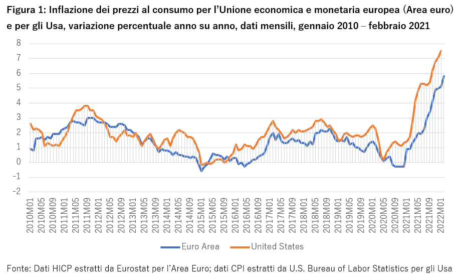 Il problema che il policy maker si trova di fronte fino al 23 febbraio è noto: la ripresa è lenta, più lenta del previsto (si veda Tabella 1); ciononostante, la pressione sui prezzi continua a salire, anche se si nota che ciò avviene molto più negli Usa che in Europa (Figura 1), e ciò forse a causa del fatto che la componente di inflazione da domanda è assai più forte, e quindi potenzialmente permanente, negli Usa, che non in Europa, nella cui dinamica dei prezzi viene stimata una forte componente da offerta quali difficoltà di approvvigionamento in generale e prezzi dell’energia e delle materie prime, di natura intrinsecamente più transitoria.