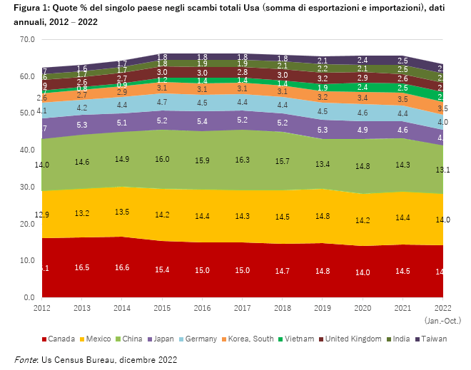 Il primo paragrafo riprende le ipotesi di ricerca che abbiamo formulato tempo fa, e cioè che con il disaccoppiamento si venisse affermando la transizione dal progetto di capitalismo liberale universale a quello di capitalismo politico, come identificato da Alessandro Aresu in ‘Le potenze del Capitalismo Politico. Stati Uniti e Cina’ e da Branko Milanovic in ‘Capitalism, Alone. The Future of the System That Rules the World’. Nel secondo paragrafo scriviamo degli avvenimenti sopravvenuti dalle elezioni presidenziali Usa del 2020 e dei mutamenti che essi hanno indotto sulle relazioni economiche internazionali come è possibile ‘misurare’ attraverso la dinamica dei flussi commerciali internazionali. Noi avevamo previsto un cambiamento importante e potenzialmente di lunga durata nell’origine e nella destinazione dei flussi di commercio estero come effetto del disaccoppiamento; vogliamo ora dare avvio ad un processo di valutazione della misura in cui pandemia, guerra, crisi energetica e alimentare, inflazione e politiche monetarie restrittive hanno influito ulteriormente su tali andamenti. Inizialmente il nostro obiettivo è limitato, poiché ovviamente non abbiamo l’ambizione di verificare la forza della relazione causale tra questi fenomeni; più modestamente, vogliamo condurre un’analisi preliminare descrittiva della evoluzione dei patterns commerciali tra gli Stati uniti e alcuni paesi che potrebbero costituire una fonte di importazioni permanentemente alternativa a quella cinese. Si tratta qui di delineare l’evoluzione delle politiche commerciali statunitensi a valle del progetto trumpiano del Make America Great Again, caratterizzato da politiche protezionistiche e dal crescente desiderio Usa di separare la parte ‘cinese’ delle proprie catene globali di produzione dalle parti più prossime, politicamente se non geograficamente. Già in un articolo del 2018, scrivevamo che il progetto dell’amministrazione Trump mostrava un cambio di strategia con il passaggio dalla logica “solo gli Stati Uniti contano” a “il Nord America conta, fino a che gli Stati Uniti dettano le regole”; in aggiunta, suggerivamo che questo si sarebbe tradotto in una crescente regionalizzazione del traffico commerciale oltre che delle catene di produzione. Ad inizio 2020 avevamo poi avanzato l’ipotesi che le caratteristiche merceologiche del commercio bilaterale mondiale mostravano già come la globalizzazione avesse imboccato in via definitiva la strade della regionalizzazione o, meglio, della ‘aggregazione’ attorno a due poli, Cina e Stati uniti.