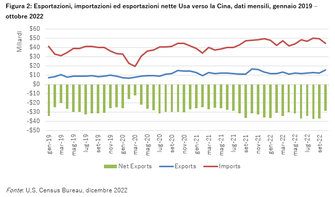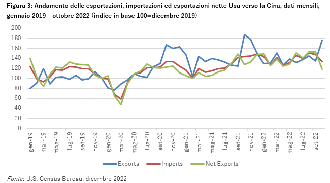 Abbiamo già sottolineato come scelte di politica commerciale restrittiva del Governo degli Stati uniti siano in essere almeno dal 2018. Di seguito riportiamo alcuni grafici significativi per verificare se qualche effetto di tali scelte sia già misurabile. In Figura 1 è riportata la quota di scambio di merci (somma di esportazioni e importazioni) degli Stati uniti con i principali partner commerciali. È interessante osservare che la quota della Cina nello scambio di merci degli Stati uniti, pari al 13,1% a ottobre 2022, è in calo da quando ha raggiunto il picco del 16,3% su base annua nel 2017. Poiché le aziende americane hanno cercato fornitori al di fuori della Cina durante la guerra commerciale tra Pechino e Washington, la quota di commercio degli Stati uniti con Paesi quali Vietnam e Messico è aumentata (per quest’ultimo in particolare l’accordo USMCA sta evidentemente funzionando).