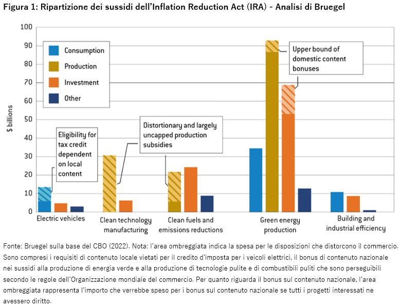 Riportiamo un estratto dell’analisi dell’IRA pubblicata sul sito del Think Tank Bruegel (Kleimann, D., N. Poitiers, A. Sapir, S. Tagliapietra, N. Véron, R. Veugelers and J. Zettelmeyer (2023) ‘How Europe should answer the US Inflation Reduction Act’, Policy Contribution 04/2023, Bruegel) che ben sintetizza la direzione di fondi dell’IRA e l’ammontare che potrebbero influenzare (distorcere) il commercio internazionale: “La figura [Figura 1] mostra il valore totale dei sussidi IRA suddivisi in sussidi destinati al consumo, alla produzione o all’investimento, indicando se i sussidi sono probabilmente distorsivi del commercio[…]. I sussidi che distorcono il commercio includono i sussidi che contengono requisiti di contenuto locale (LCR) e i sussidi che ne non contengono, ma sono “perseguibili” secondo le regole dell’Organizzazione Mondiale del Commercio. I sussidi che distorcono il commercio includono il credito d’imposta per le auto elettriche condizionato da LCR (7,5 miliardi di dollari), la maggior parte della spesa per il sostegno alla produzione di tecnologie pulite (32 miliardi di dollari su un totale di 37 miliardi di dollari), la maggior parte dei sussidi per i carburanti puliti e la riduzione delle emissioni (16 miliardi di dollari) e la quota di sussidi per la produzione di energia verde e gli investimenti che si prevede includano bonus per il contenuto locale.”. Come fanno notare gli autori, queste stime devono essere considerate con cautela, poiché la maggior parte delle misure non ha un tetto massimo in termini di volume o di valore complessivo.