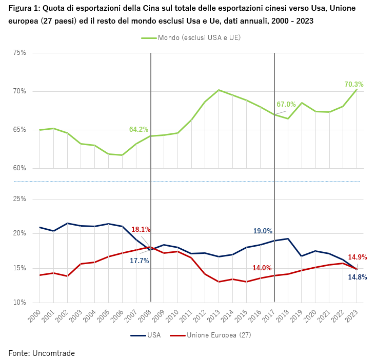 La seconda informazione importante fornita dalla Figura 1 è che la quota del totale delle esportazioni cinesi destinata al mondo al netto di Usa ed Europa è in crescita per tutto il periodo 2021-2023; la terza è che tale quota cresce in particolare a partire dal picco del 2017, cioè in corrispondenza dell’introduzione delle politiche protezionistiche del governo Trump: il messaggio è che a fronte dei dazi imposti dagli Usa sulle proprie esportazioni, le imprese cinesi ri-orientano le proprie esportazioni verso una molteplicità di paesi terzi. Ne deduciamo che coloro che si chiedono come faranno le imprese cinesi a trovare mercato per le esportazioni ‘rifiutate’ dagli Usa non hanno avuto modo di costruire una figura equivalente alla nostra Figura 1[3].