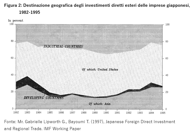 La storia, necessariamente stilizzata, è presto raccontata. Le importazioni statunitensi di auto giapponesi (prodotte in Giappone) cominciarono a crescere già dalla metà degli anni Sessanta; poi, con la ‘crisi petrolifera’ e i conseguenti aumenti di domanda del consumatore Usa di auto di piccola cilindrata, esse continuavano ad aumentare sistematicamente per tutti gli anni Settanta. L’imposizione del dazio produsse però un fenomeno che i libri di testo avevano a quel tempo preso in considerazione solo marginalmente: i produttori giapponesi passarono a produrre componenti che poi esportavano per l’assemblaggio finale in impianti, di proprietà giapponese, localizzati negli Stati uniti. Risultato: per tutti gli anni Ottanta la quota di investimenti diretti esteri delle imprese giapponesi verso gli Usa aumentò (Figura 2). Veniva così alla ribalta l’importanza delle catene globali di produzione e di approvvigionamento.