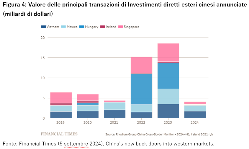 Quale potrebbe essere la reazione cinese? Si noti che questo tipo di ‘soluzione’ potrebbe essere utile anche per la Cina: la guerra commerciale tra Usa e Cina ha creato un insieme di paesi, definiti ‘connettori’ in un recente paper del Fondo monetario internazionale, che non sono allineati alla politica commerciale Usa o Cina ma stanno rapidamente acquisendo importanza e fungendo da ponte tra le regioni economiche. E riprendendo quanto riportato dal Financial Times (Figura 4): “La motivazione principale dietro lo spostamento degli investimenti [cinesi] verso questi paesi — tra cui Singapore, Vietnam, Irlanda, Ungheria e Messico, tra gli altri — è stata quella di aggirare le misure protezionistiche imposte dalle potenze occidentali contro le aziende con sede in Cina”.