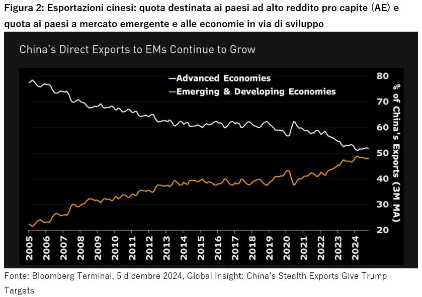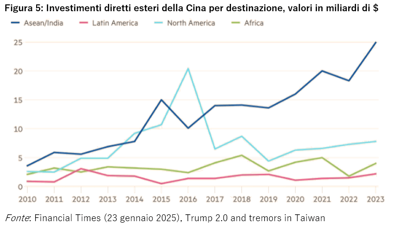 Questi flussi ‘nuovi’ possono essere diretti verso la Cina, la quale sta in effetti adottando una politica di ‘NO DAZI’ verso le merci di produzione dei paesi a reddito pro capite inferiore a quello dei paesi ad alto reddito pro capite (anche se nel 2024, secondo l’analisi del Financial Times, la Cina si è assicurata poco meno di 400 progetti, un numero prossimo al minimo storico e una frazione degli oltre 1.000 investimenti ricevuti ogni anno nel decennio fino alla metà degli anni 2010). Ma possono anche essere indirizzati verso altri paesi ‘minori’ – quelli che il Financial Times ha definito paesi “connettori”. Le destinazioni principali degli Investimenti diretti della Cina sono il Sud-Est asiatico, l’India e il Medio Oriente, mentre si riduce la dipendenza dalle economie avanzate dell’Occidente. L’aumento degli investimenti cinesi nel sud del mondo dovrebbe aiutare ad alleviare gli effetti delle tariffe sotto l’amministrazione Trump (Figura 5).