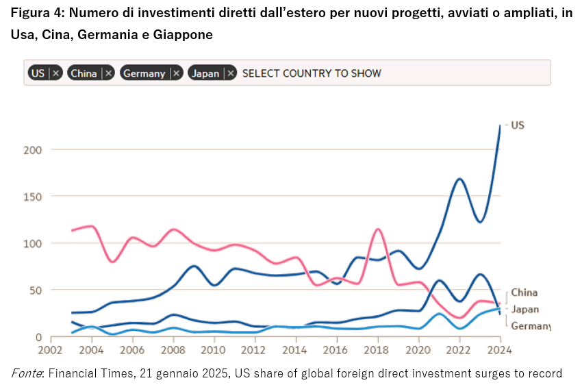 In questo scenario, quindi, l’applicazione di dazi, o la dichiarazione di volerli applicare, hanno un effetto sulla direzione che gli investimenti diretti esteri prendono. Effetto diretto di questa scelta è il ri-posizionamento di fasi del processo produttivo nel paese che impone il dazio o, alternativamente, in uno dei paesi che sono ‘vicini’ al polo che impone il dazio.. Se osserviamo gli investimenti diretti esteri negli Stati uniti, un’analisi del Financial Times ha mostrato che gli Stati uniti hanno attirato più di 2.100 nuovi progetti greenfield tra dicembre 2023 e novembre 2024. Il valore stimato dei nuovi progetti di investimento diretto estero (IDE) negli Stati Uniti è aumentato di oltre 100 miliardi di dollari, raggiungendo i 227 miliardi di dollari (Figura 4). In contrasto con l’aumento degli IDE in entrata, il numero di progetti esteri originati dagli Stati Uniti si è ridotto a 2.600 nei 12 mesi fino a novembre, il più basso in due decenni, escludendo il culmine della pandemia.