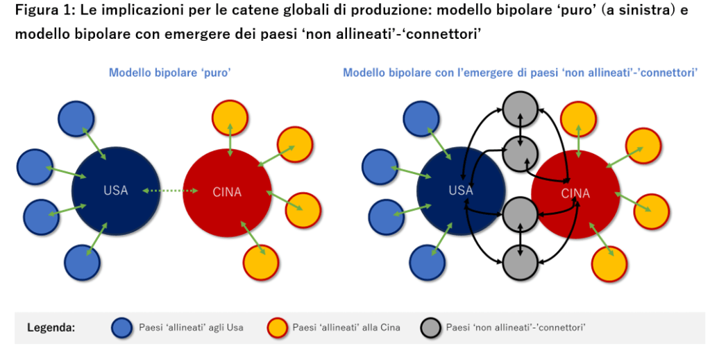 2. Modello 2: modello bipolare con emergere dei paesi ‘non allineati’-‘connettori’. Due poli, ma anche un elevato numero di paesi ‘indipendenti’ che adotteranno politiche di vicinanza con entrambi i poli senza rapporti di esclusività e, così facendo, manterranno anche i propri spazi di manovra per sviluppare rapporti economici tra di loro.